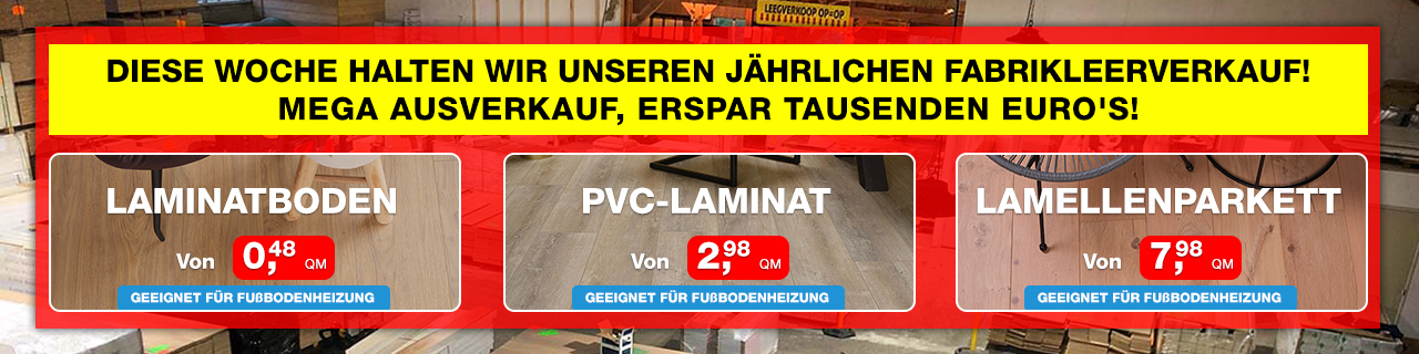 Zur Eröffnung der neuen Fabrik verkaufen wir alle Holzfußböden und Lamellenparkettböden sehr günstig, so können Sie weit unter dem Einkaufspreis einen kompletten Boden kaufen. Wenn Sie einen Holzboden oder Lamellenparkett von mehr als 40m² kaufen der nicht im Angebot ist, bekommen Sie einen gratis Kaminofen dazu.